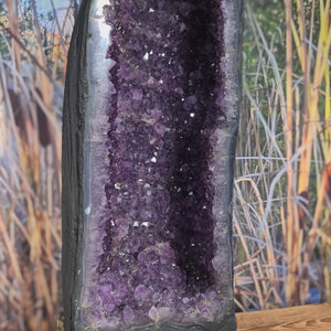 This Amethystdrusen come from Brazil, their insides have grown naturally and can also be small Calcite crystals, Rutile Have inclusions or other mineral inclusions, each amethyst druse is unique! They are recovered and carefully cut open, the edges are polished. This creates the colors and shapes of the border, which often comes out Purchase, Chalcedon and rock crystal exists, particularly to its advantage. So that it can stand stably, a small base is made with concrete. The outside of the amethyst druse is painted to prevent particles of the outer skin from falling off and thus make it “suitable for living”.