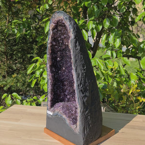 An amethyst druse can clear and transform space energies. It influences the feeling of space harmoniously and can Relaxation support financially. Amethyst from Steinwelten is also ideal for meditation. This stone is used in gemstone therapy to give inner peace, cleanse thoughts and spaces and relieve grief. All Amethyst Geodes from Steinwelten are special individual pieces that were selected by us with love. The particularly beautiful dark color is rare in Brazilian amethyst and is a sign of the high quality of our druze.