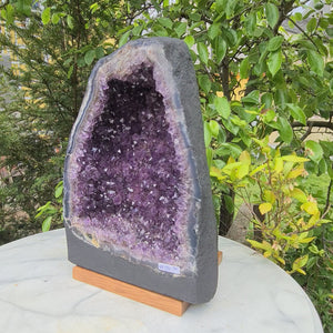 An amethyst druse can clear and transform space energies. It influences the feeling of space harmoniously and can Relaxation support financially. Amethyst from Steinwelten is also ideal for meditation. This stone is used in gemstone therapy to give inner peace, cleanse thoughts and spaces and relieve grief. All Amethyst Geodes from Steinwelten are special individual pieces that were selected by us with love. The particularly beautiful dark color is rare in Brazilian amethyst and is a sign of the high quality of our druze.
