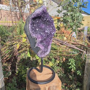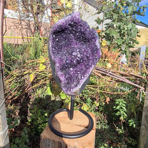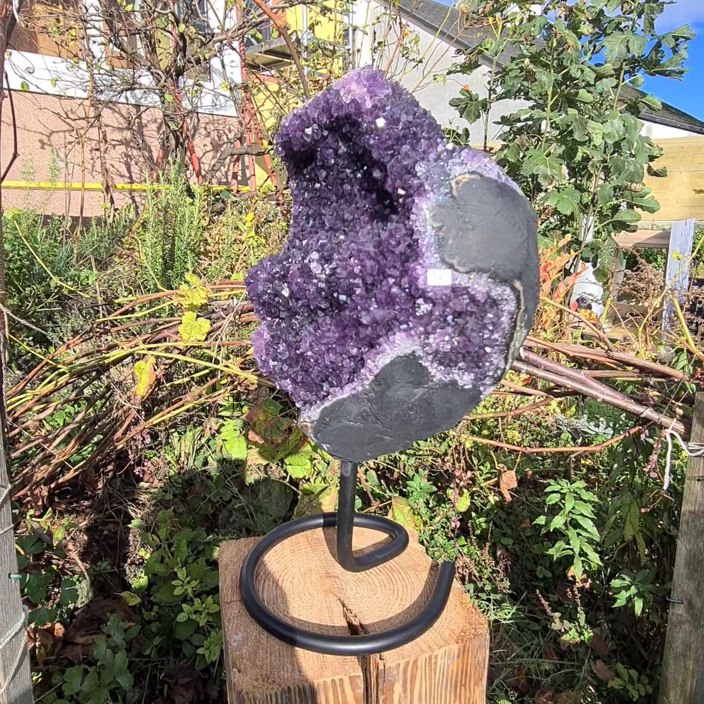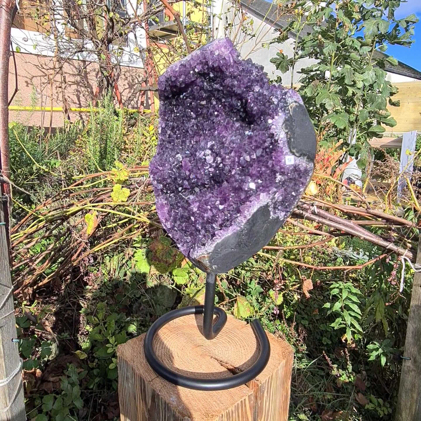 This high quality Amethyst from Uruguay by 1A Museum quality has a particularly dark, intense color. Uruguay Amethysts are characterized by the naturally very regular crystals and extremely dark purple color. Due to their more regular growth, these druses shine and sparkle even more intensely than their relatives from Brazil. This unique one exhibit Comes with a metal stand and enriches everyone Living room!