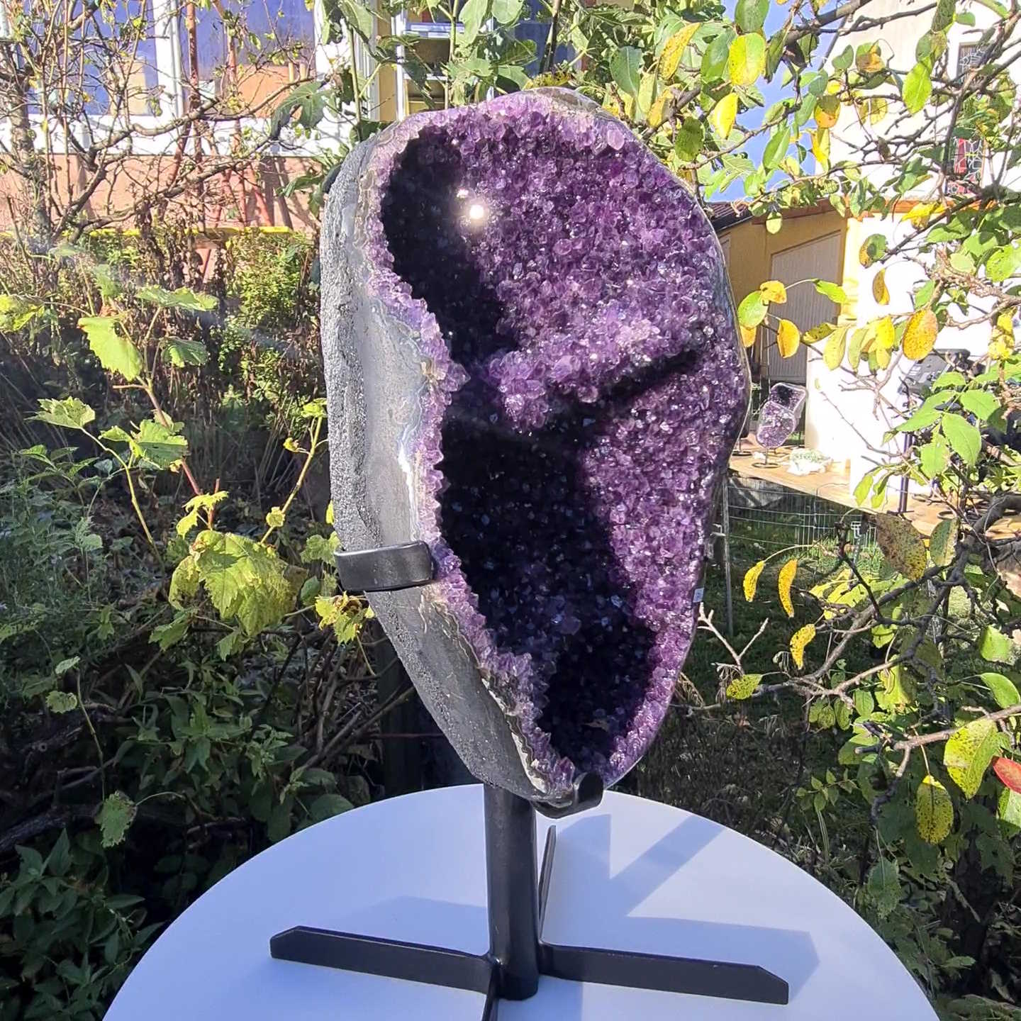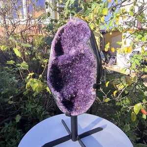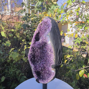 This high quality Amethyst from Uruguay by 1A Museum quality has a particularly dark, intense color. Uruguay Amethysts are characterized by the naturally very regular crystals and extremely dark purple color. Due to their more regular growth, these druses shine and sparkle even more intensely than their relatives from Brazil. This unique one exhibit Comes with a metal stand and enriches everyone Living room!