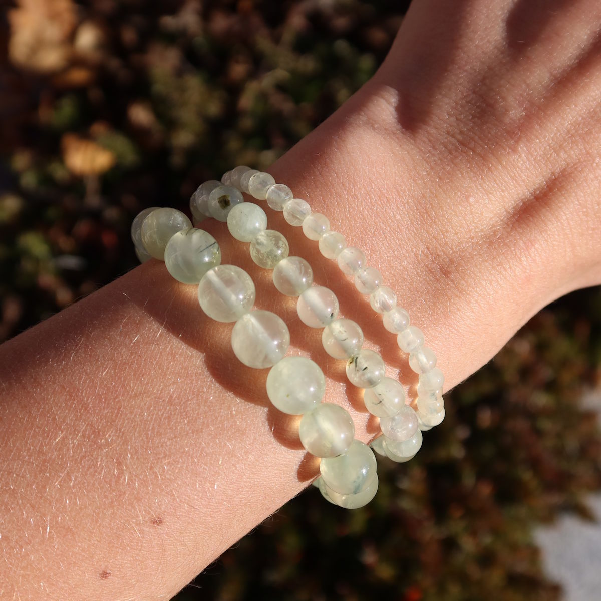 Dieses zarte Armband aus Prehnit besticht durch seinen sanften Grünton und seine wunderschöne Ausstrahlung und leichte Maserung.