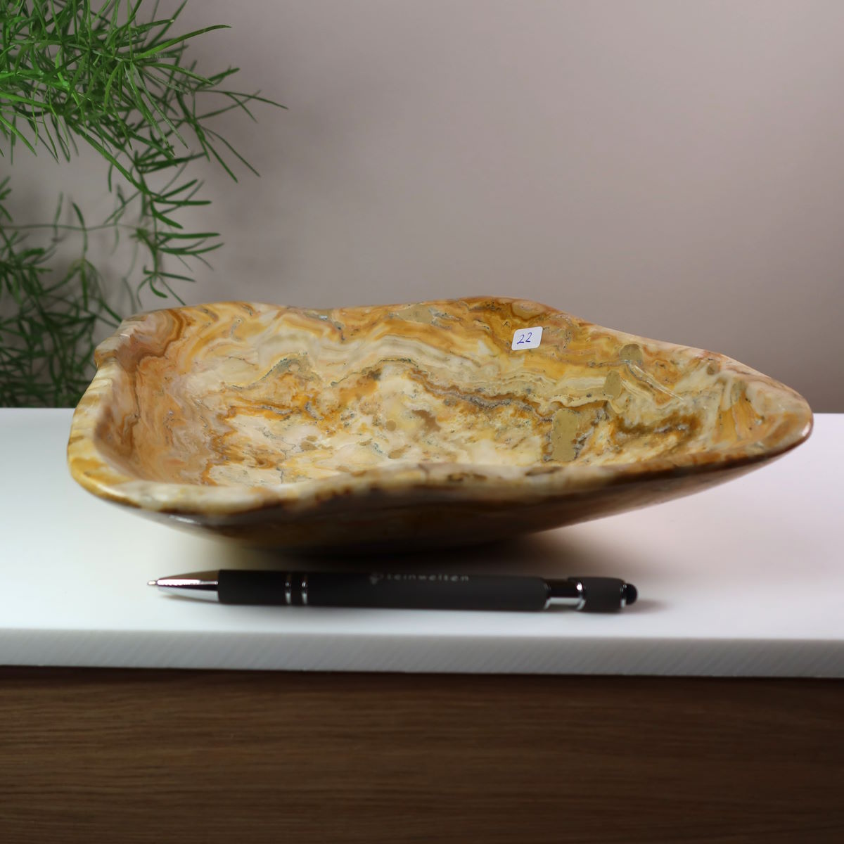 Ce bol en pierre d'aragonite a été réalisé à la main. L'aragonite en bandes est utilisée dans la guérison par les cristaux pour la relaxation même en cas de stress intense ainsi que pour favoriser la digestion et renforcer les disques intervertébraux. Les bols de pierres précieuses sont souvent utilisés pour transférer leur énergie positive au contenu qu’ils contiennent. Ces pièces individuelles découpées à la main sont également parfaites pour une décoration spéciale de votre maison.