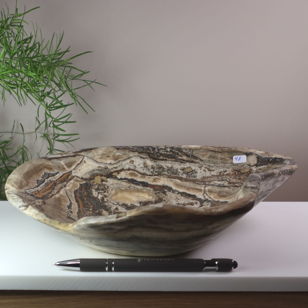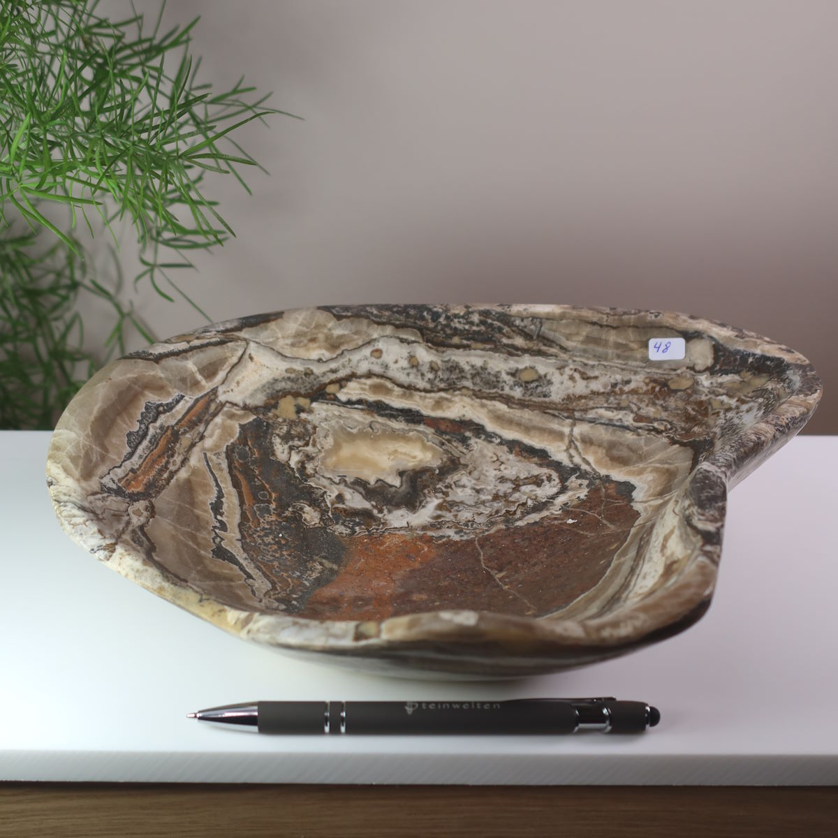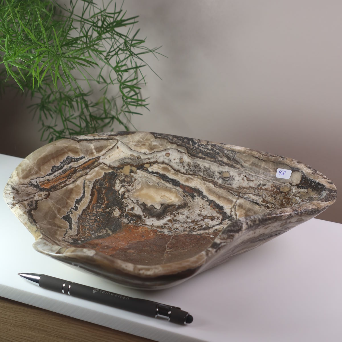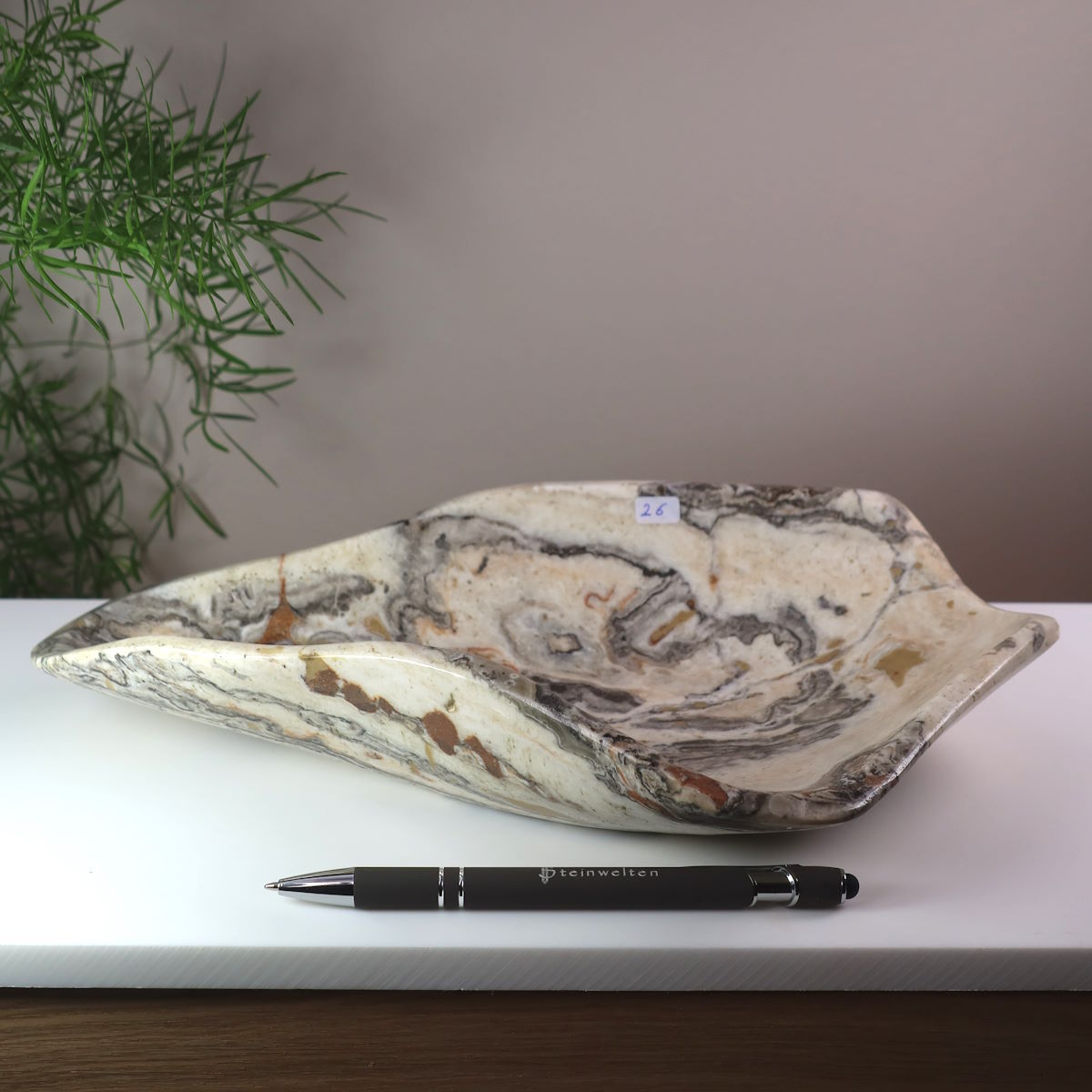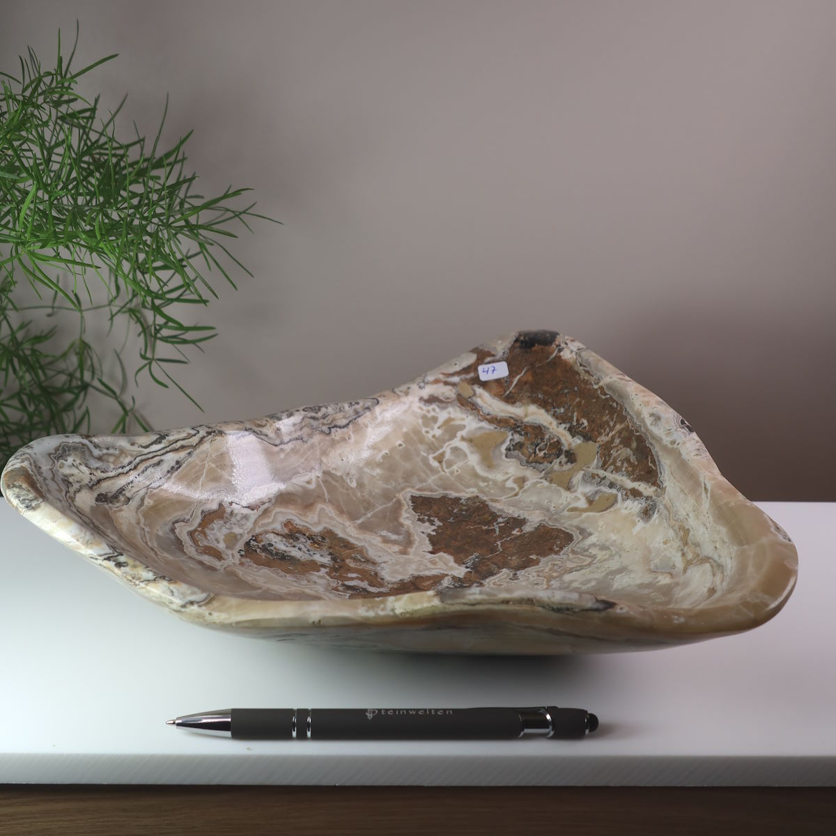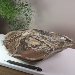 Ce bol en pierre d'aragonite a été réalisé à la main. L'aragonite en bandes est utilisée dans la guérison par les cristaux pour la relaxation même en cas de stress intense ainsi que pour favoriser la digestion et renforcer les disques intervertébraux. Les bols de pierres précieuses sont souvent utilisés pour transférer leur énergie positive au contenu qu’ils contiennent. Ces pièces individuelles découpées à la main sont également parfaites pour une décoration spéciale de votre maison.