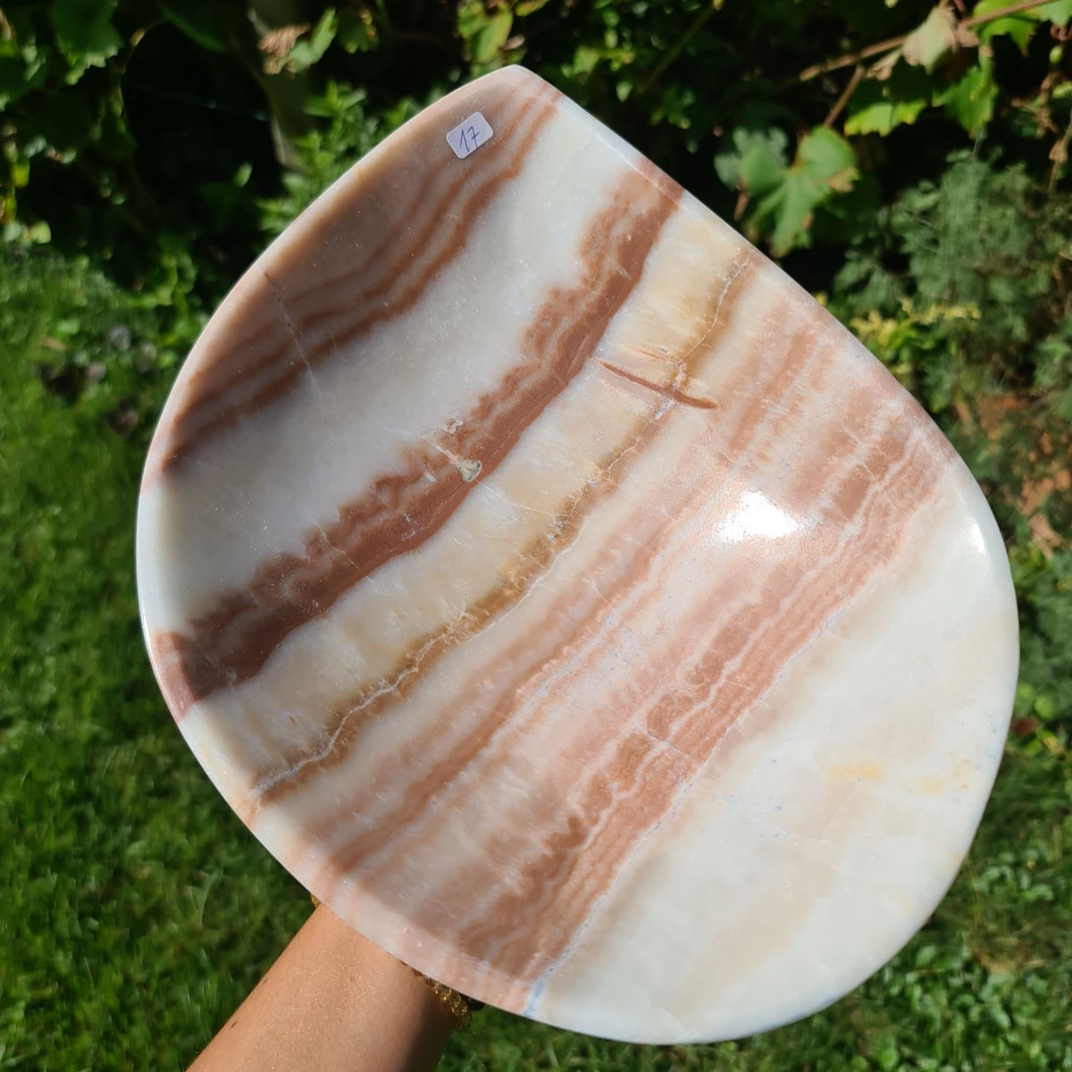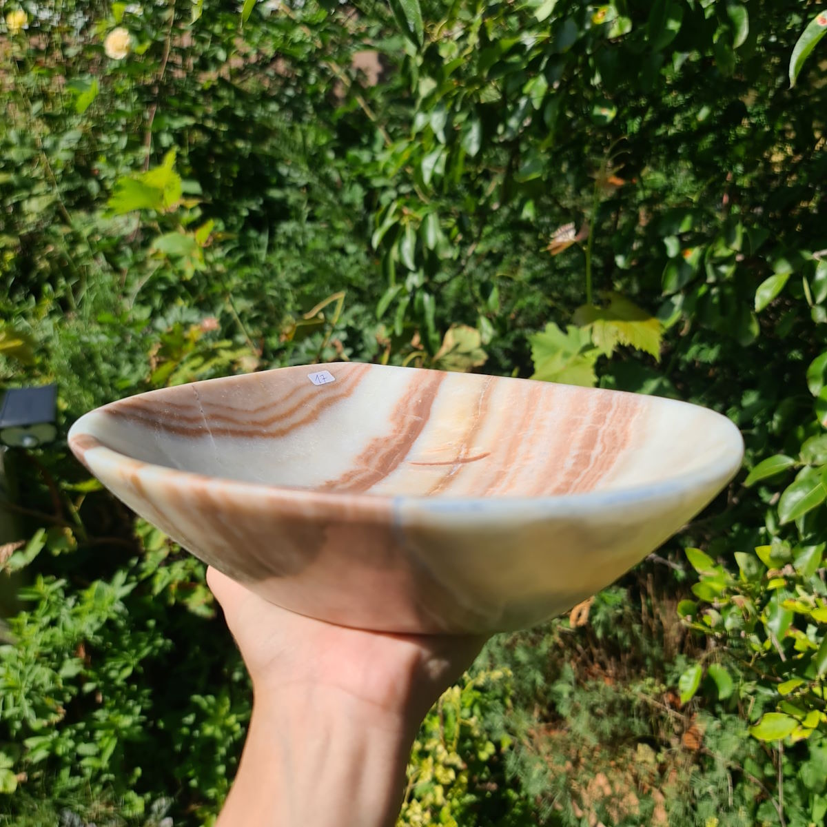 Ce bol en pierre d'aragonite a été réalisé à la main. L'aragonite en bandes est utilisée dans la guérison par les cristaux pour la relaxation même en cas de stress intense ainsi que pour favoriser la digestion et renforcer les disques intervertébraux. Les bols de pierres précieuses sont souvent utilisés pour transférer leur énergie positive au contenu qu’ils contiennent. Ces pièces individuelles découpées à la main sont également parfaites pour une décoration spéciale de votre maison.