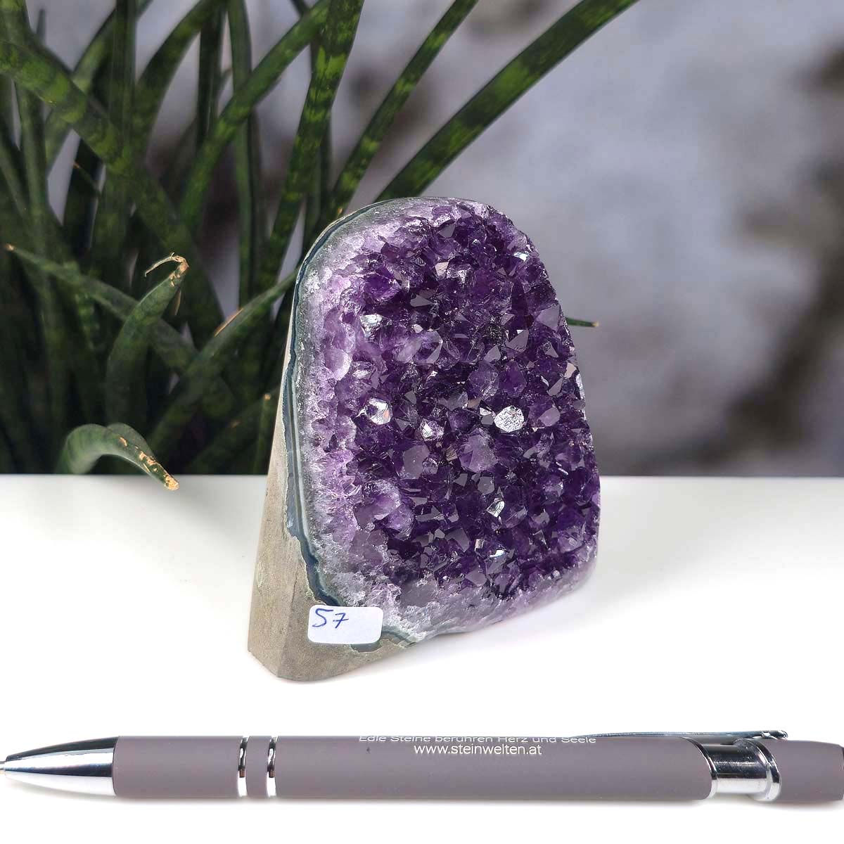 Dieser hochwertige Amethyst aus Uruguay hat einen besonders dunklen, intensiven Farbton. Uruguay Amethyste Geoden zeichnen sich durch die von Natur aus sehr regelmäßigen Kristalle und äußerst dunkle lila Farbe aus. Durch den regelmäßigeren Wuchs leuchten und funkeln diese Drusen noch intensiver als ihre Verwandten aus Brasilien.