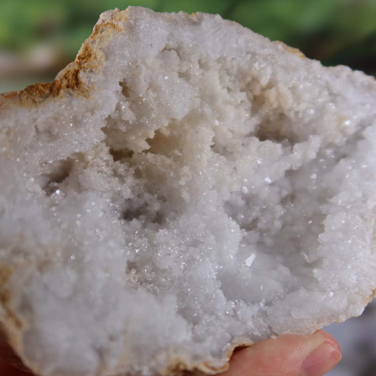 Die Quarzgeoden werden bereits geöffnet geliefert, einzelne lose Kristalle sind durch das Öffnen wahrscheinlich und keine Qualitätsminderung.