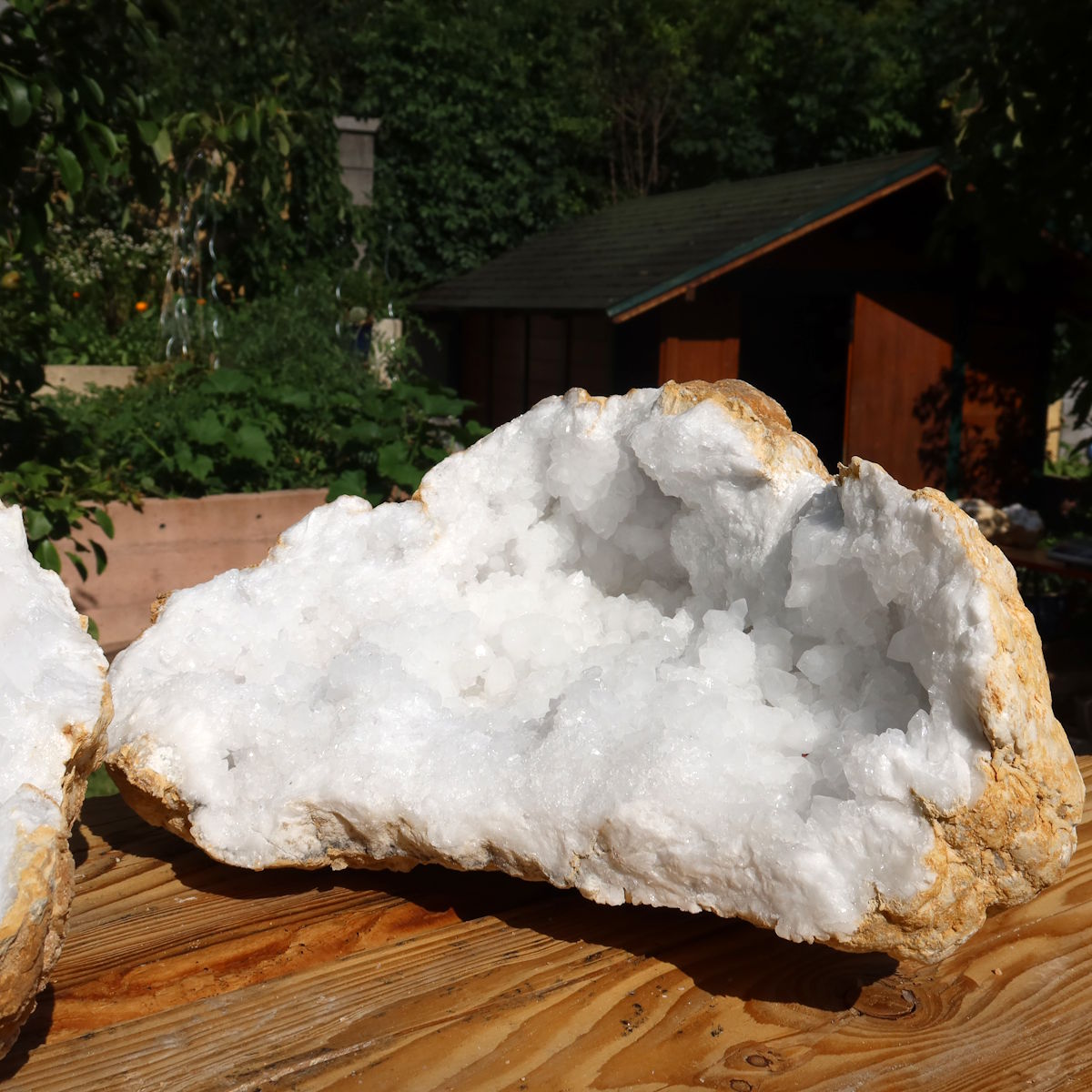 Die Quarzgeoden werden bereits geöffnet geliefert, einzelne lose Kristalle sind durch das Öffnen wahrscheinlich und keine Qualitätsminderung.