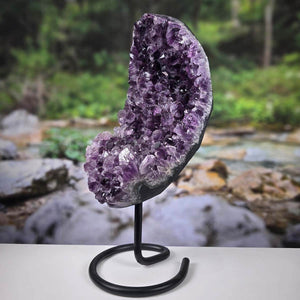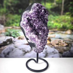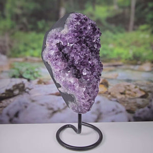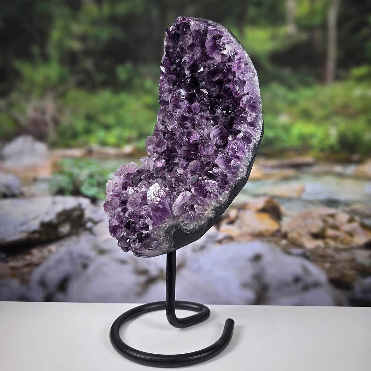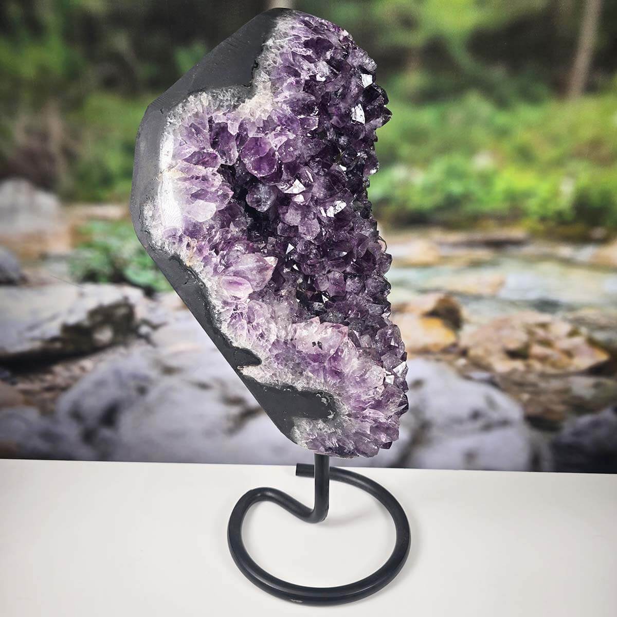 Uruguay Amethyste zeichnen sich durch die von Natur aus sehr regelmäßigen Kristalle und äußerst dunkle lila Farbe aus. Durch den regelmäßigeren Wuchs leuchten und funkeln diese Drusen noch intensiver als ihre Verwandten aus Brasilien. Dieses einzigartige Ausstellungsstück wird mit Metallständer geliefert und bereichert jeden Wohnraum!