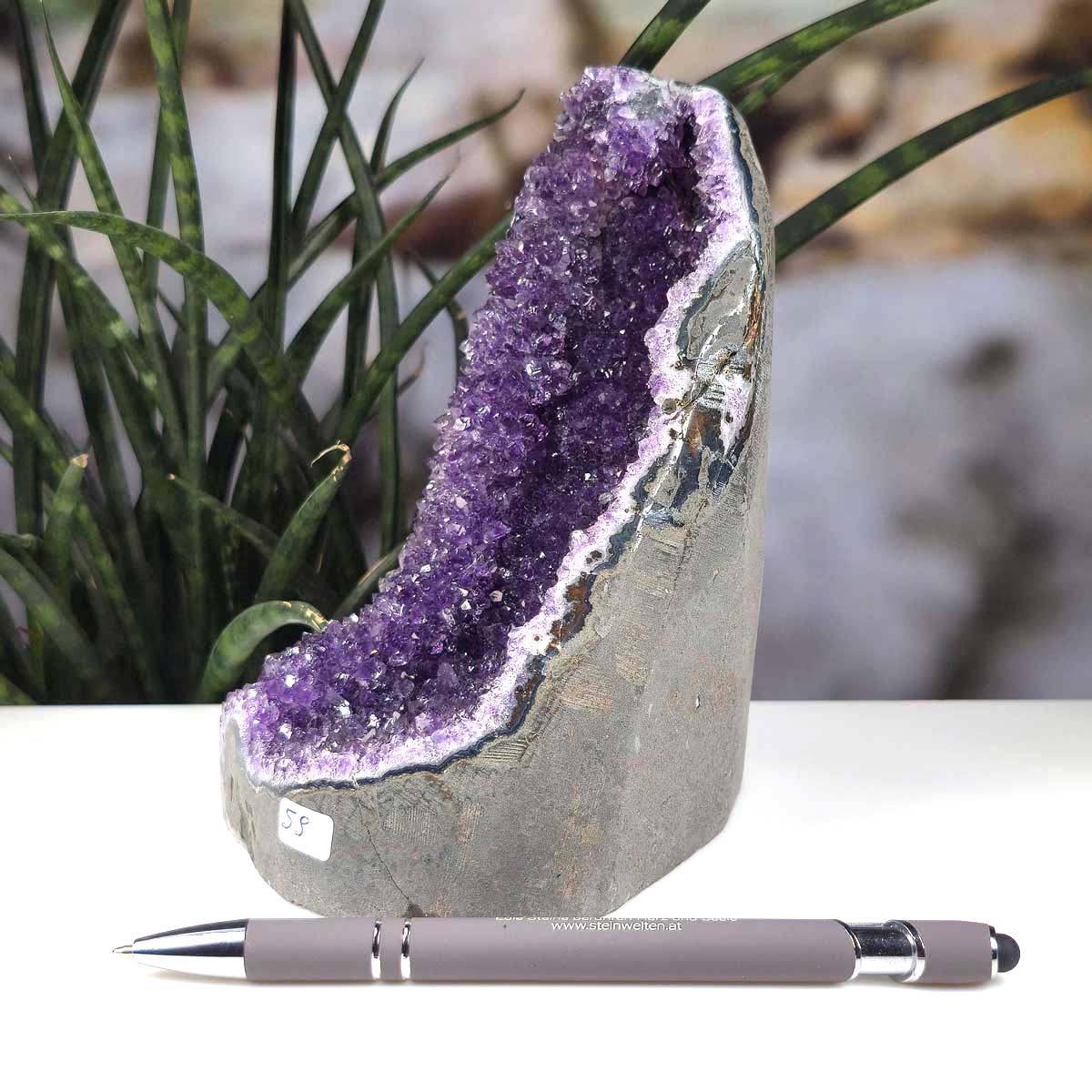 Questo pregiato ametista proveniente dall'Uruguay ha una tonalità particolarmente scura e intensa. Le geodi di ametista dell'Uruguay si distinguono per i cristalli naturalmente molto regolari e per il colore viola estremamente scuro. Grazie alla crescita più regolare, queste druse brillano e scintillano ancora più intensamente rispetto alle loro parenti brasiliane.