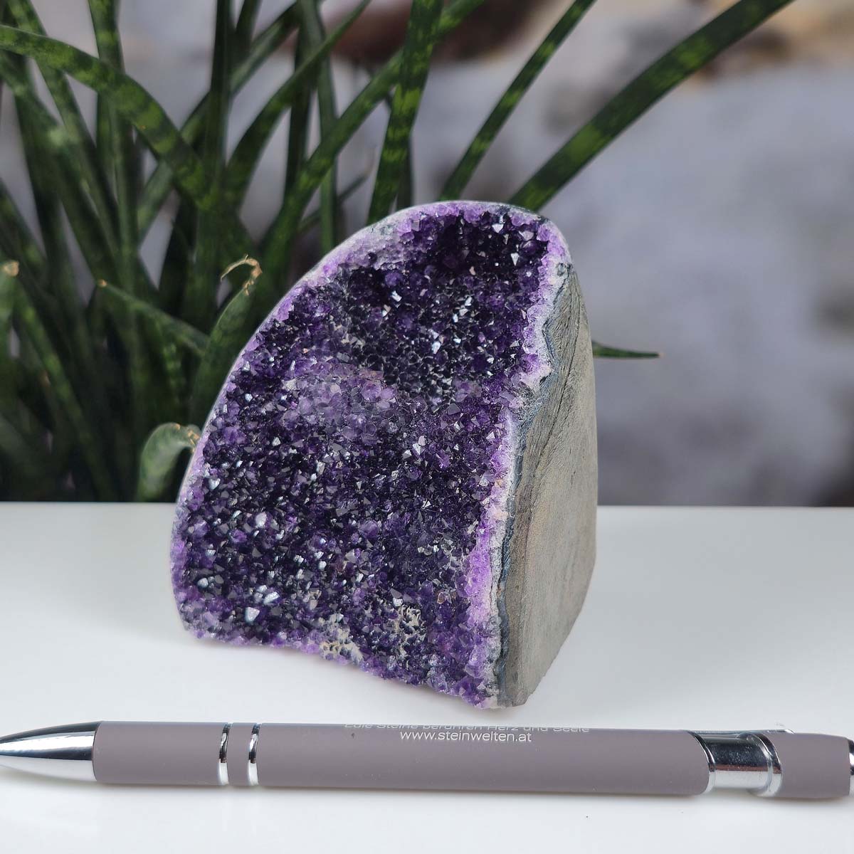 Questo pregiato ametista proveniente dall'Uruguay ha una tonalità particolarmente scura e intensa. Le geodi di ametista dell'Uruguay si distinguono per i cristalli naturalmente molto regolari e per il colore viola estremamente scuro. Grazie alla crescita più regolare, queste druse brillano e scintillano ancora più intensamente rispetto alle loro parenti brasiliane.