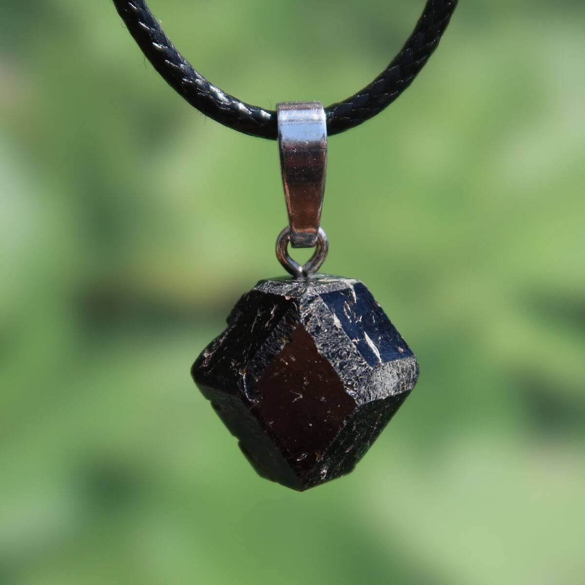 La melanite è una varietà rara, ricca di titanio del granato appartenente al gruppo degli andraditi. Cristallizza in forme lucide e ottaedriche ed è nota per la sua struttura e colore eccezionali. Ogni pendente viene selezionato con cura e nella nostra officina viene dotato di un vero anello in argento, rivestito con rodio per proteggere l’argento dall’ossidazione.