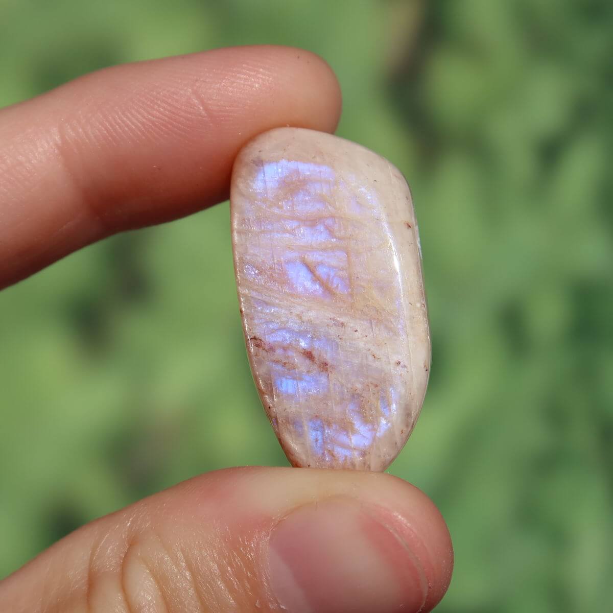 La nostra pietra di luna è vera pietra di luna, non un “pietra di luna arcobaleno” come viene spesso chiamato il labradorite bianco. Quest’ultimo è disponibile separatamente nel negozio.