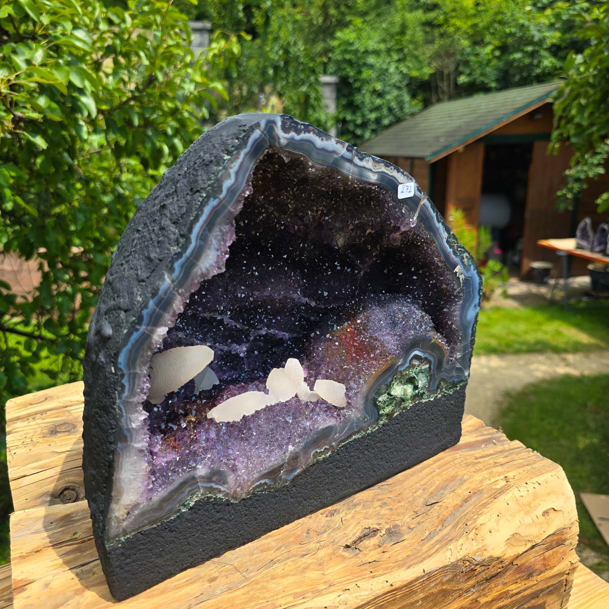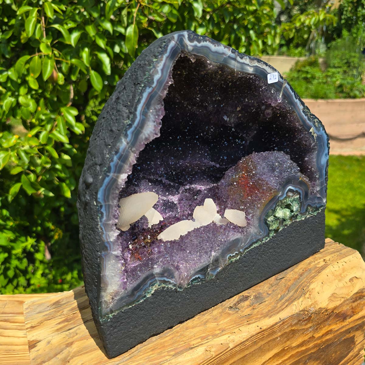 Sono prodotti naturali puri, il suo interno è naturalmente cresciuto e può presentare anche piccoli cristalli di calcite, inclusioni di rutilo o altre inclusioni minerali. Vengono estratti e tagliati con cura, i bordi sono lucidati. Questo fa risaltare particolarmente i colori e le forme del bordo, che spesso è composto da agate, calcedonio e cristallo di rocca. Per garantire stabilità, la base sul fondo è stabilizzata con cemento. La Il retro della geode di ametista è rivestito con vernice, per evitare la caduta di particelle dalla superficie esterna e renderla così "adatta all'appartamento".