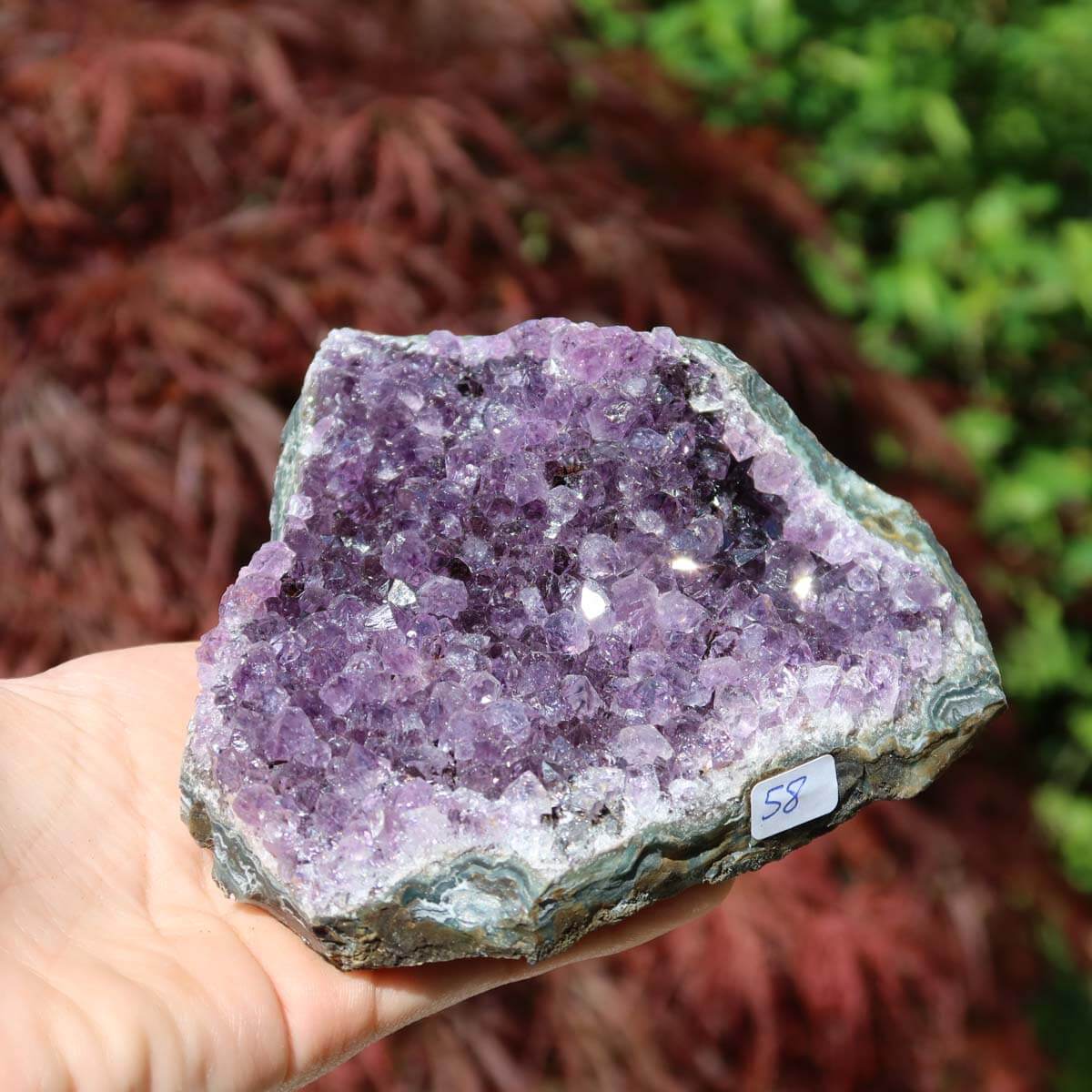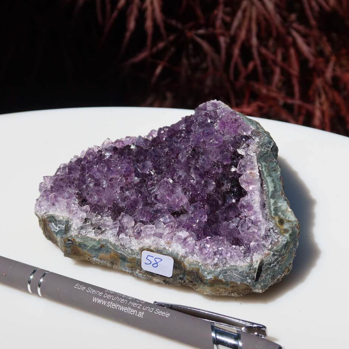 Diese Stücke werden verwendet, um kleinere Steine zu reinigen und aufzuladen. Dafür legt man die gewaschenen Steine einfach auf den Amethyst – er wirkt wie eine „Urlaubsinsel“ für deine Steine. Amethyst ist zudem dafür bekannt, dass er Raumenergien klären und transformieren kann. In der Steinheilkunde steht er für Spiritualität, inneren Frieden und Entspannung.