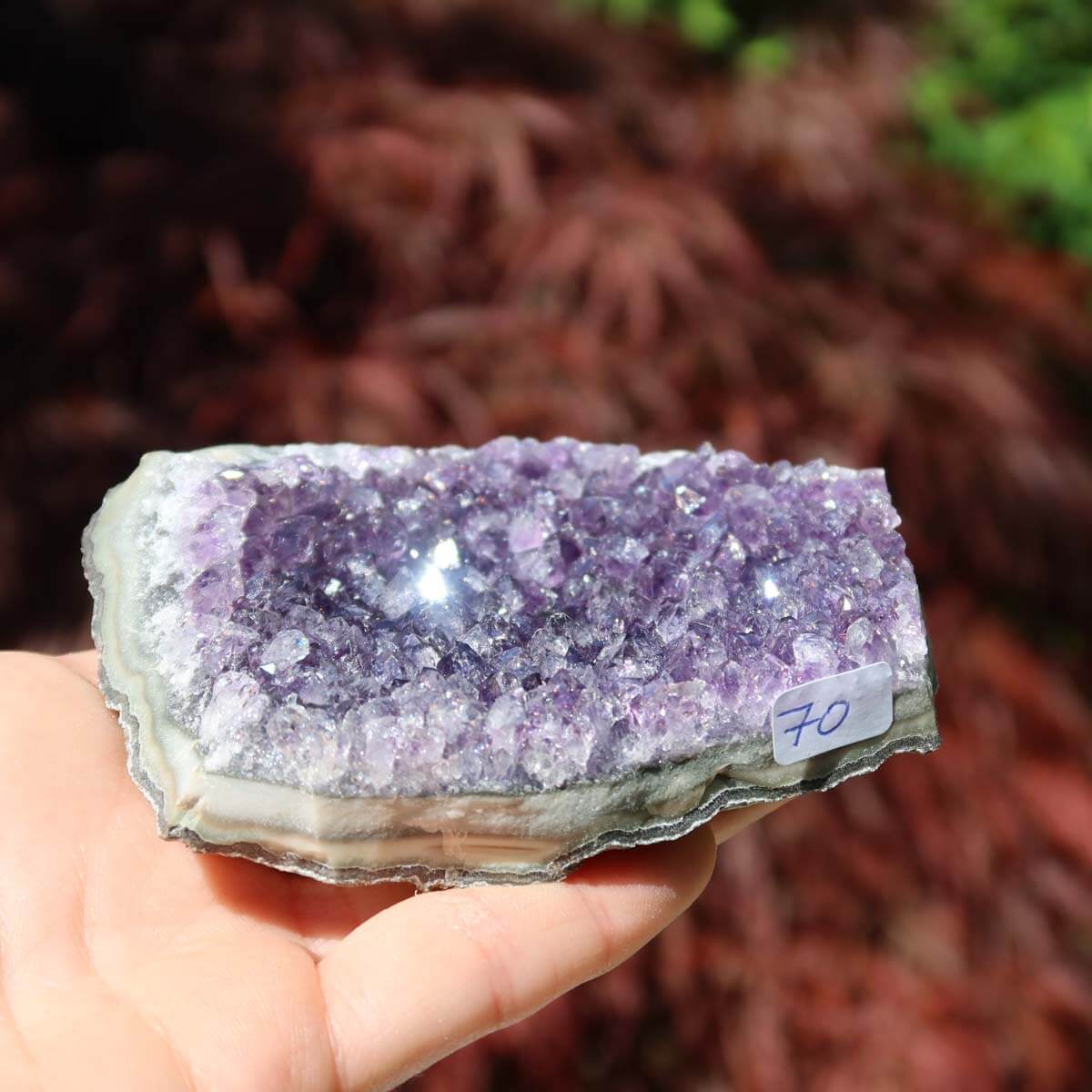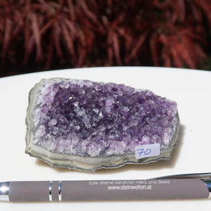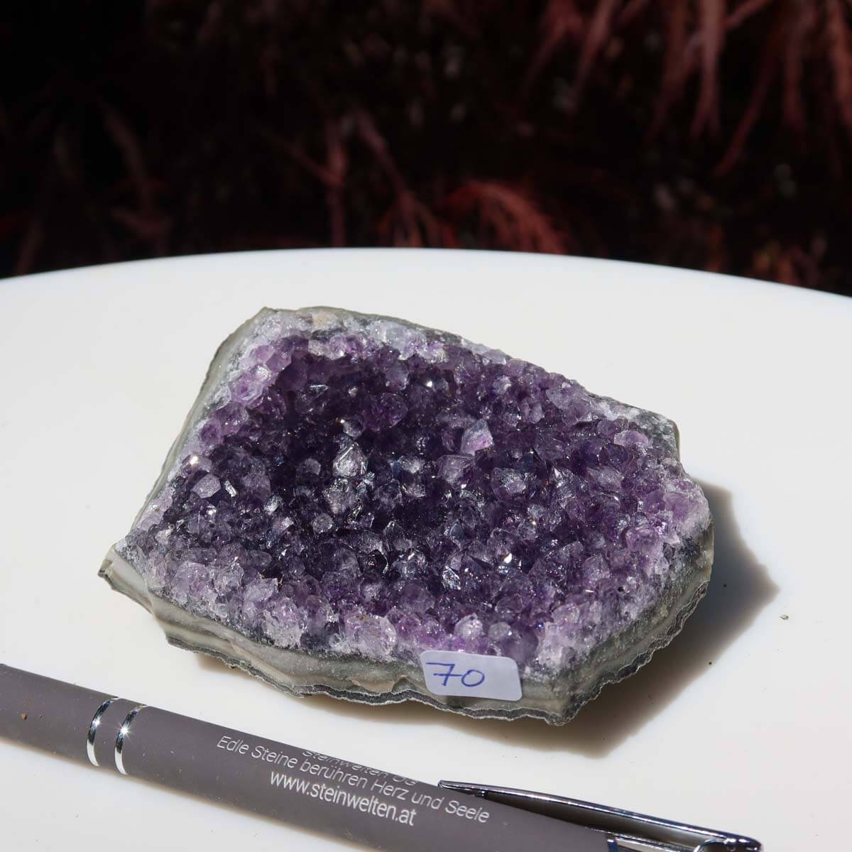 Diese Stücke werden verwendet, um kleinere Steine zu reinigen und aufzuladen. Dafür legt man die gewaschenen Steine einfach auf den Amethyst – er wirkt wie eine „Urlaubsinsel“ für deine Steine. Amethyst ist zudem dafür bekannt, dass er Raumenergien klären und transformieren kann. In der Steinheilkunde steht er für Spiritualität, inneren Frieden und Entspannung.