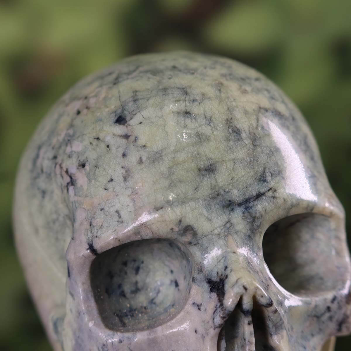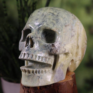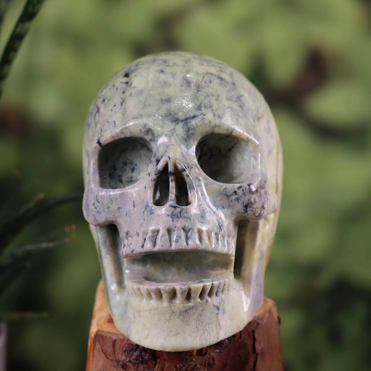 Unser Serpentin geschliffener Natur Stein Schädel ist ein wahres Meisterwerk, das durch präzise Handarbeit entsteht. Jeder Totenkopf wird sorgfältig aus einem einzigen Stück Edelstein gefertigt. Diese aufwändige Verarbeitung macht jeden Skull zu einem Unikat, das in Optik, Farbe und Energie einzigartig ist.