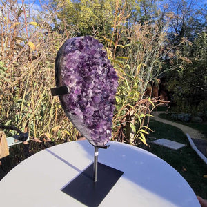 Dieser hochwertige Amethyst aus Uruguay von 1A Museumsqualität hat einen besonders dunklen, intensiven Farbton. Uruguay Amethyste zeichnen sich durch die von Natur aus sehr regelmäßigen Kristalle und äußerst dunkle lila Farbe aus. Durch den regelmäßigeren Wuchs leuchten und funkeln diese Drusen noch intensiver als ihre Verwandten aus Brasilien. Dieses einzigartige Ausstellungsstück wird mit Metallständer geliefert und bereichert jeden Wohnraum!